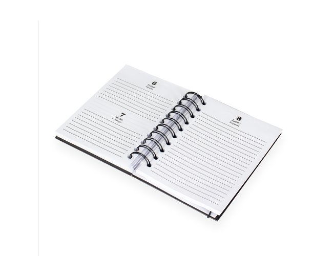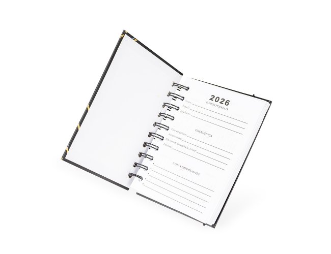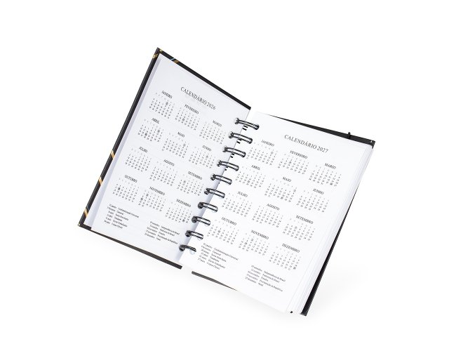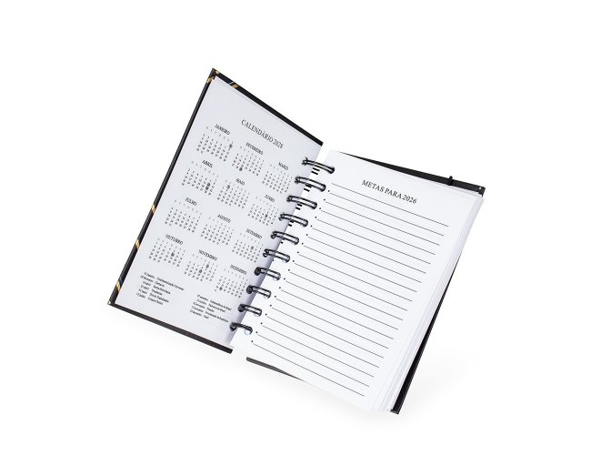 Agenda diária 2026 em capa dura, com marcador de páginas em fita se cetim, elástico de fechamento e encadernação Wire-O. Conta ainda com páginas dedicadas a dados pessoais, calendários de 2026 até 2028, além de listas de metas, planejamento mensal e contatos.