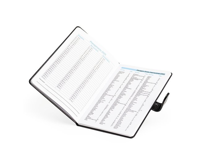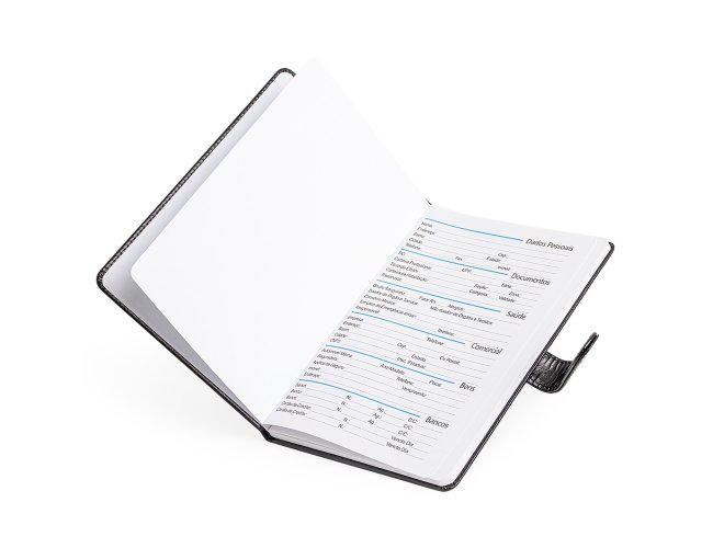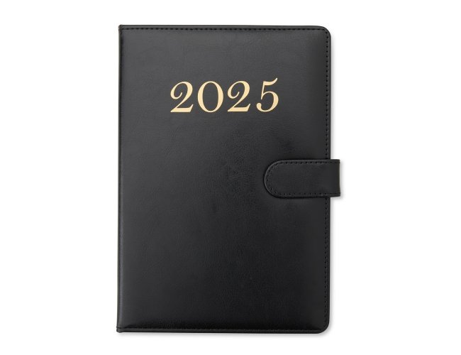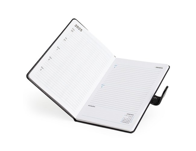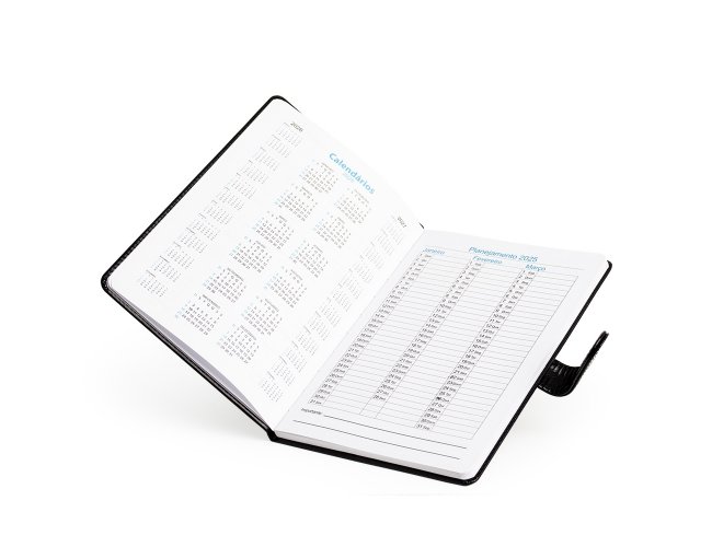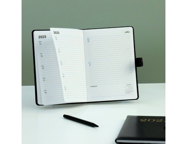 Agenda semanal 2025 produzida em couro PU com fecho magnético. Contém folhas para dados pessoais, calendários 2025 à 2027 e planejamento 2025.