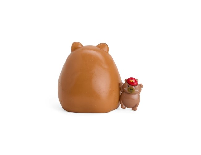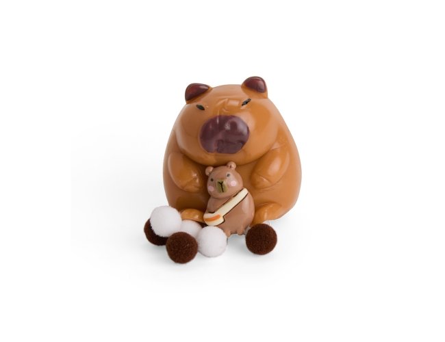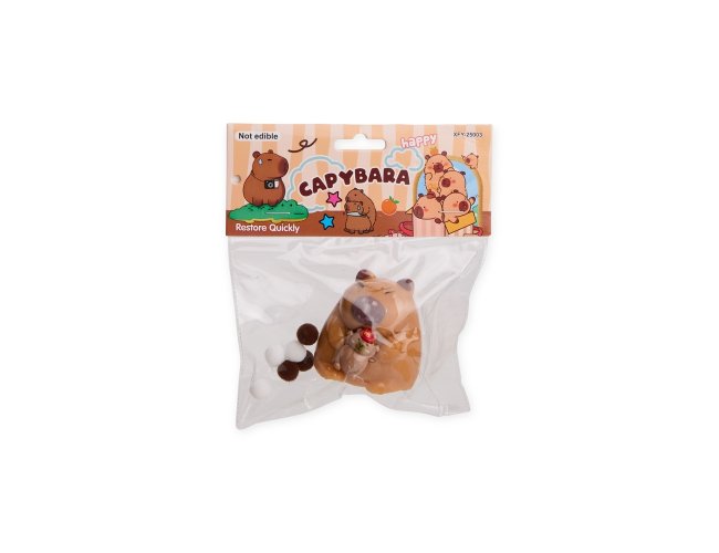 Brinquedo apertável antiestresse com formato de capivara. Feito em borracha termoplástica, possui textura lisa e macia, podendo aderir facilmente a superfícies lisas. Acompanha acessórios decorativos de plástico e pelúcia.