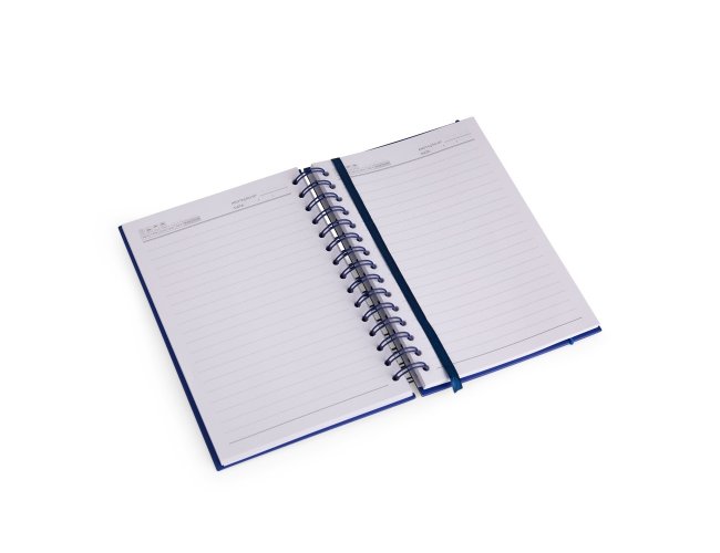 Caderno com capa dura em couchê, encadernação wire-o, marcador de páginas em fita de cetim e elástico para fechamento. Conta com aproximadamente 160 folhas brancas com pauta.