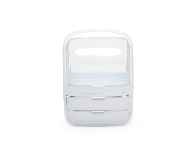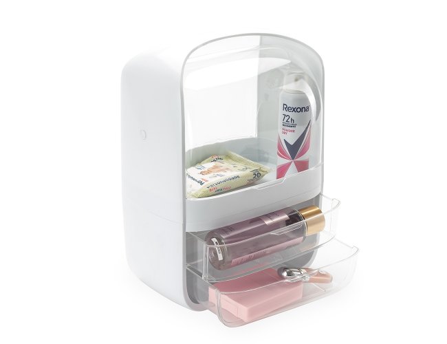 A caixa organizadora para maquiagens e cosméticos é prática e eficiente. Feita em plástico resistente com tampas de acrílico, ela protege os itens contra poeira e umidade, garantindo que tudo fique sempre seguro e preservado. Com um compartimento principal espaçoso e duas gavetas extras, é possível armazenar tudo de forma organizada. Além disso, a alça de transporte facilita levar a caixa para qualquer lugar, transformando qualquer ambiente no espaço perfeito para a rotina de beleza.