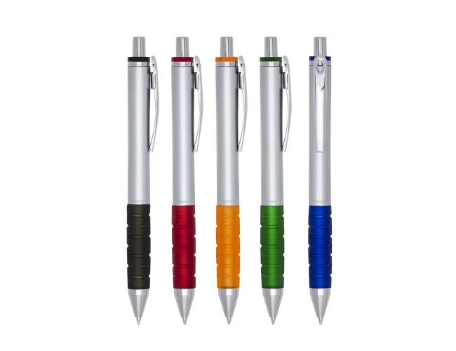 Caneta plástica com detalhe emborrachado, carga esferográfica azul 1.0 mm e acionamento por clique.