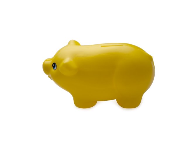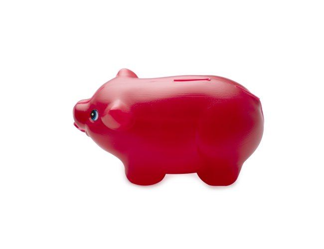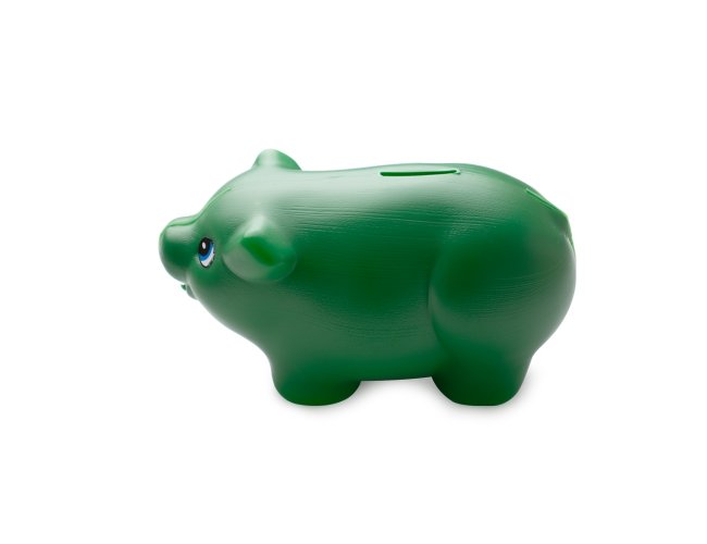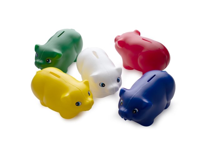 Cofre em formato de porco de plástico. O cofre possui abertura na parte superior para inserção de dinheiro ou moedas, e para abri-lo, é necessário cortá-lo.