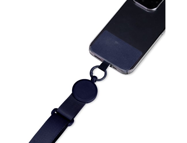 Cordão com alça ajustável para celular feito em poliéster. O acessório é fixado a um cartão retangular que se encaixa na parte interna da capa do celular, próximo à entrada de carregamento USB.