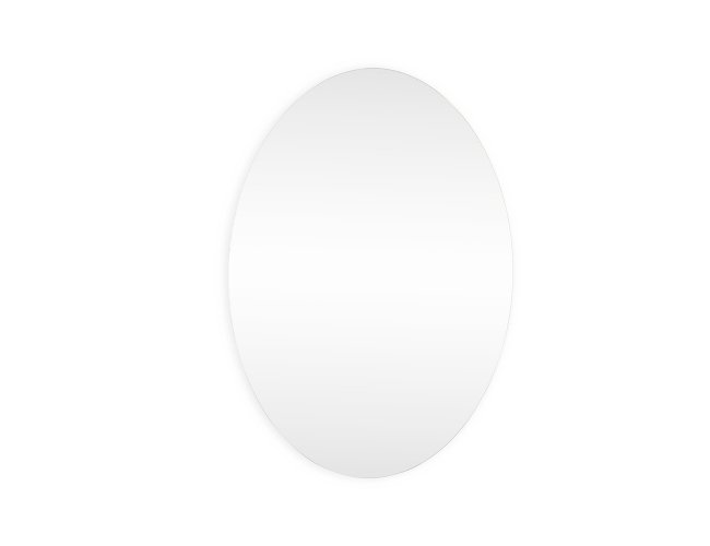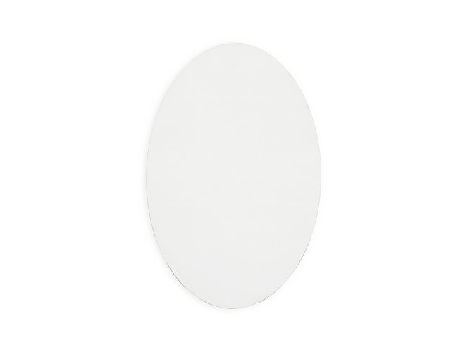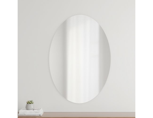 Espelho feito em acrílico com formato oval e fundo adesivo para fixação em paredes e outras superfícies planas.