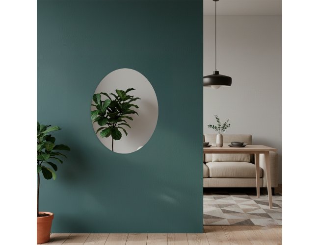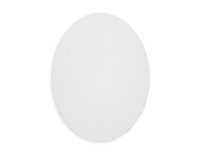 Espelho oval em acrílico com fundo adesivo para fixação em paredes e outras superfícies lisas.