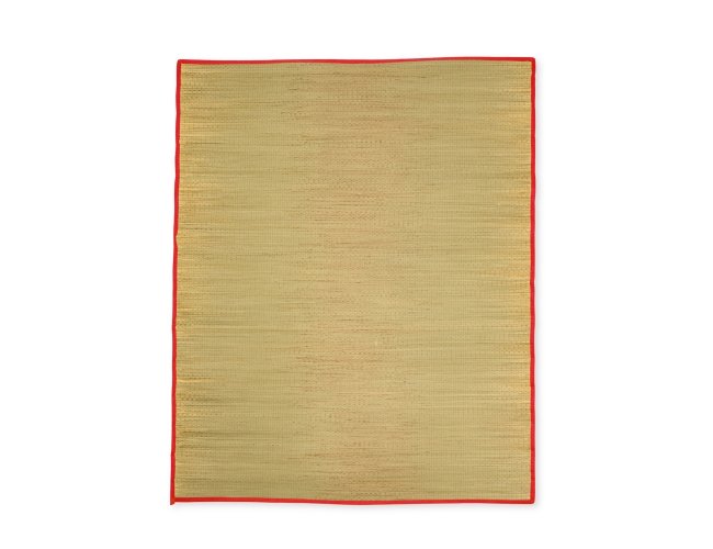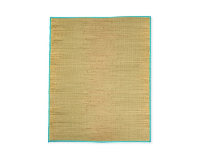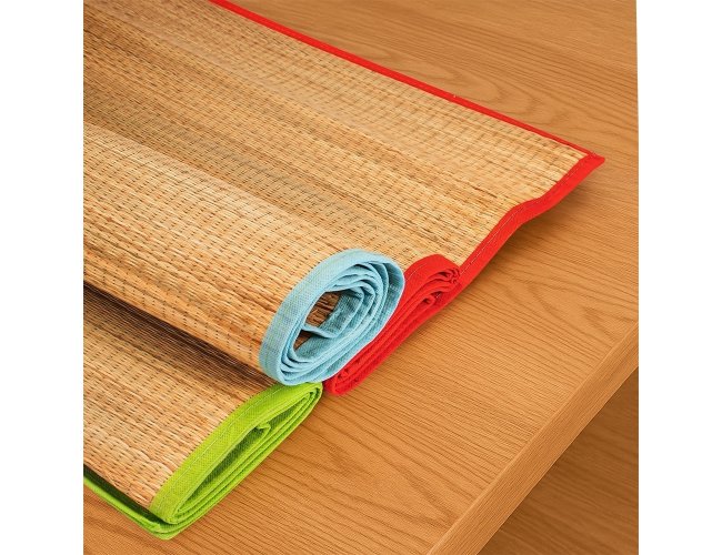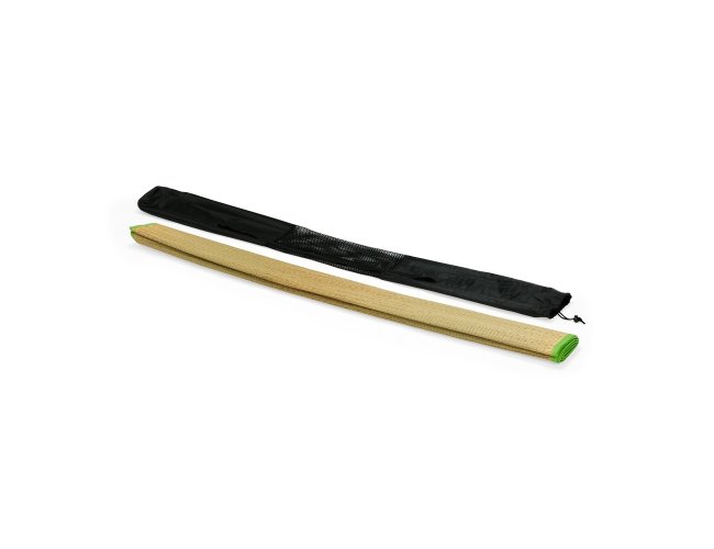 Esteira leve em palha natural com bordas costuradas em nylon. Acompanha saco de nylon com seção telada, cordão de fechamento e alça regulável para transporte.