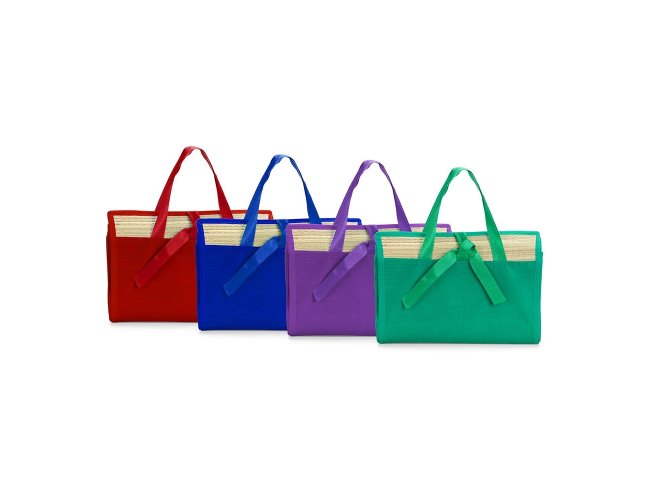 Esteira dobrável em palha natural com bordas costuradas em nylon dividindo a esteira em três partes. Além disso, possui um par de alças costuradas para transporte.