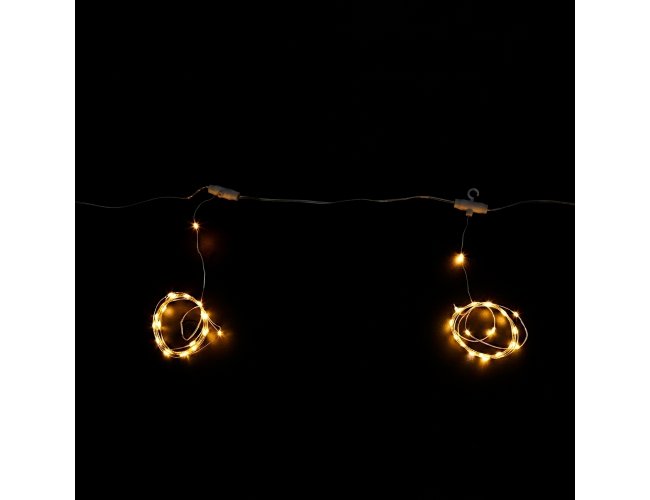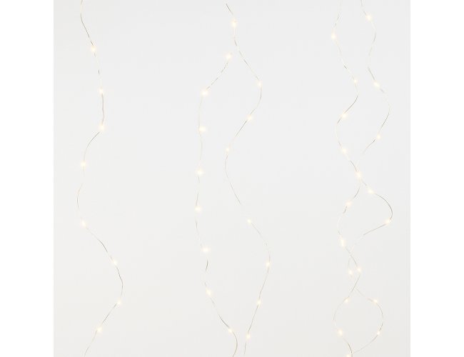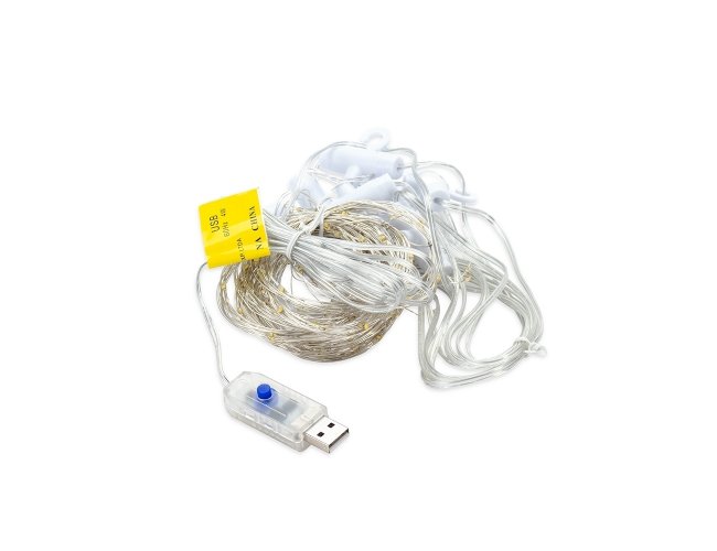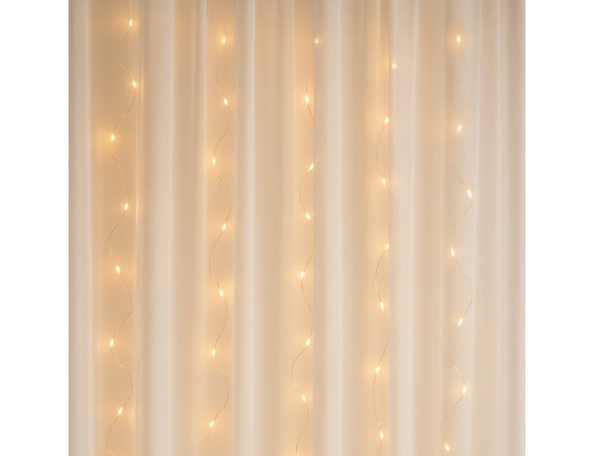 Fio de fada LED em estilo cortina. Conta com 200 LEDs distribuídos em fios de arame e aproximadamente 4,5m de cabo de alimentação USB. Possui ganchos plásticos para fixação embutidos, além de oito modos de iluminação e quatro níveis de ajuste de intensidade. Acompanha controle remoto para acionamento das luzes.