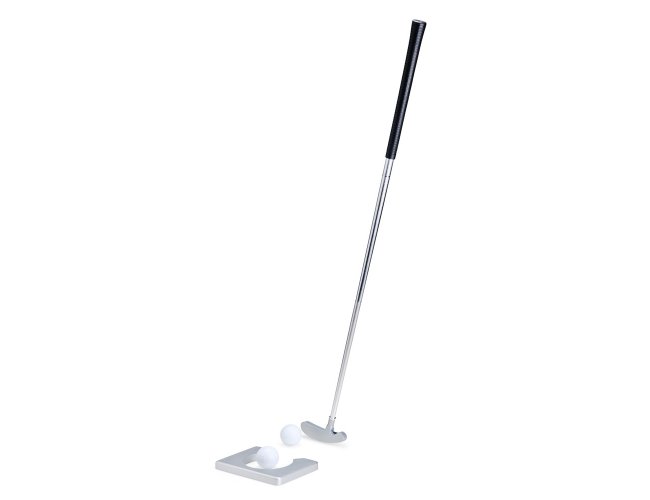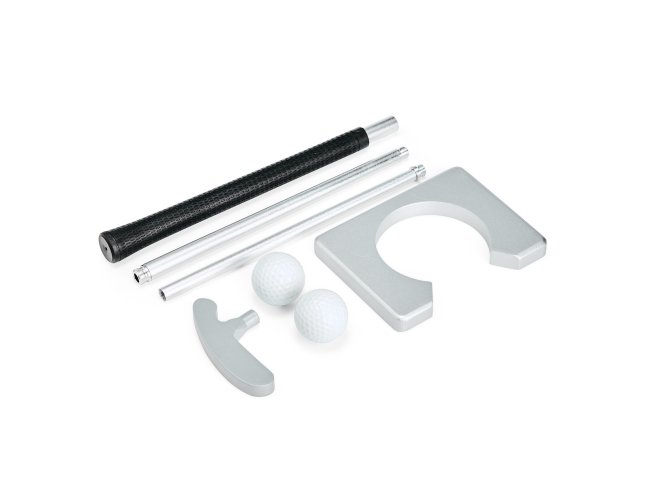 Kit para treino de golfe com quatro itens: taco montável em metal, moldura de alvo em MDF em formato de buraco e duas bolinhas em material sintético. Acompanha estojo em couro sintético com fechamento em zíper para acomodar o conjunto.