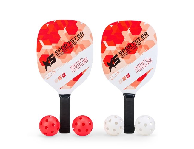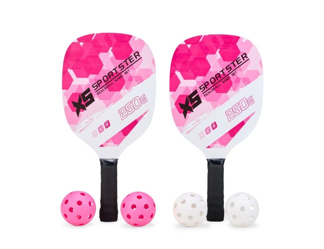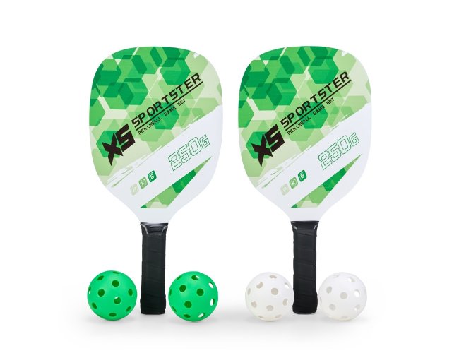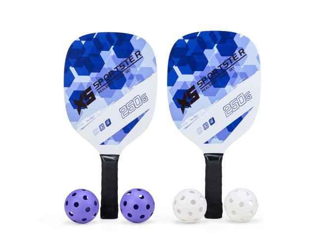 Kit Pickleball com duas raquetes de madeira (sendo uma face personalizada e outra lisa) com grip composto em fibras de carbono e vidro e quatro bolas plástica com 26 furos. Acompanha bolsa de nylon com alça de mão e visor plástico transparente.
