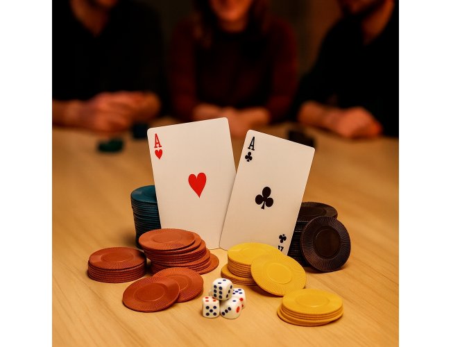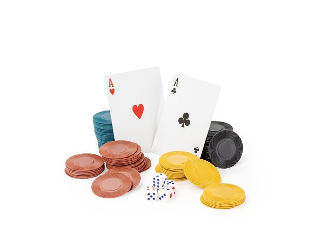 Kit poker composto por um baralho completo com 54 cartas, 100 fichas plásticas divididas em quatro cores diferentes, uma ficha de dealer e quatro dados de seis faces. Acompanha estojo metálico e folheto de regras em inglês.