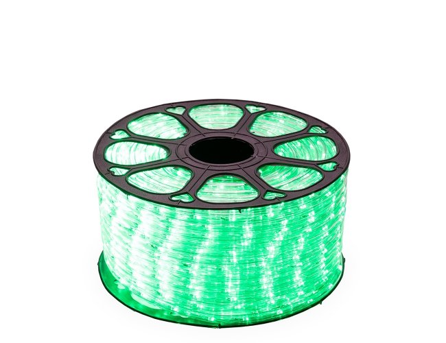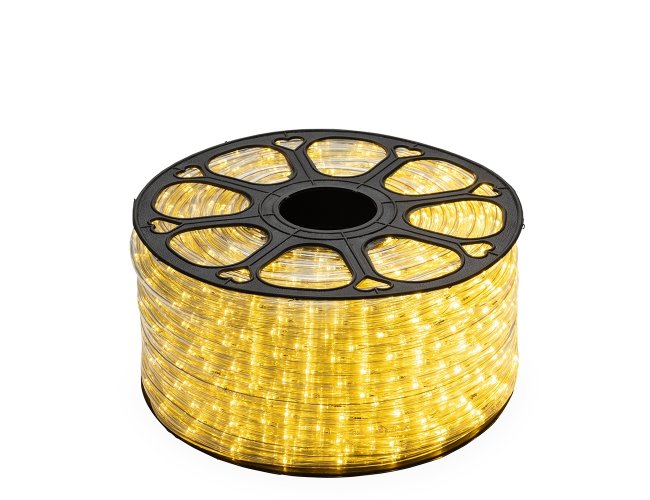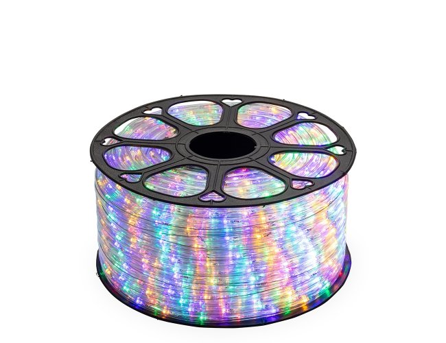 Mangueira de LED redonda resistente a respingos dágua com 100m de comprimento total e 127V de voltagem. Conta com áreas demarcadas de corte a cada 2 metros em sua extensão. Acompanha 4 rabichos com plug de tomada, sendo um já conectado à mangueira, além de 2 emendas e 4 terminais de silicone para fechamento das pontas.