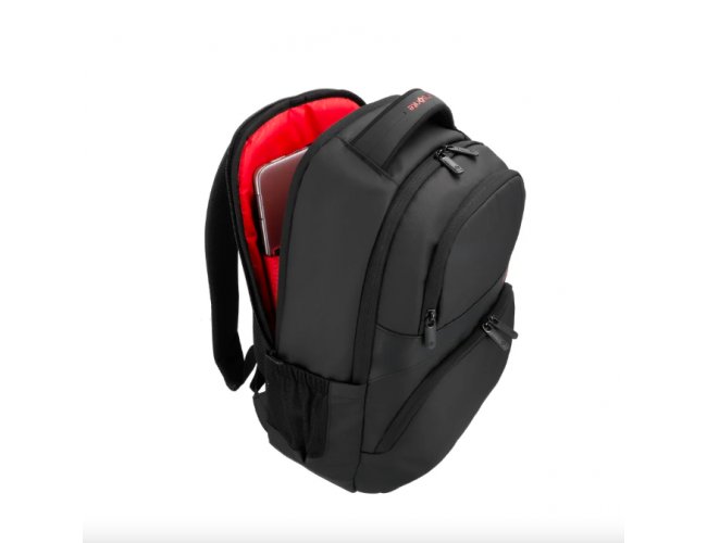 Com um design minimalista na cor preta e um interior vermelho vibrante, ela une estilo e funcionalidade. Seu espaço inteligente permite transportar seu notebook, tablet e todos os itens essenciais com máxima organização, praticidade e conforto.