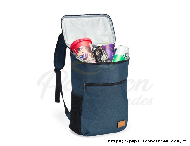 Mochila térmica confeccionada em poliéster catiônico 300D resistente à água e capacidade máxima para até 18 litros. Possui revestimento térmico antivazamento em PEVA atóxico no compartimento principal, além de um bolso frontal com fechamento em zíper, dois bolsos laterais em espuma com elástico, duas alças para as costas e uma alça de mão em nylon. Acompanha plaquinha em couro sintético fixada com velcro.