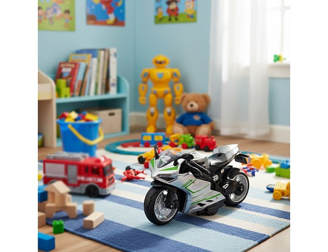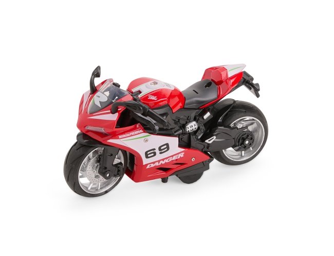 Moto esportiva em miniatura com estrutura em plástico. Possui mecanismo de fricção e acionamento de iluminação e efeitos sonoros por toque. Acompanha três baterias LR41.