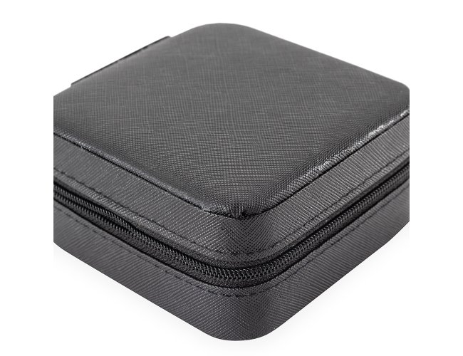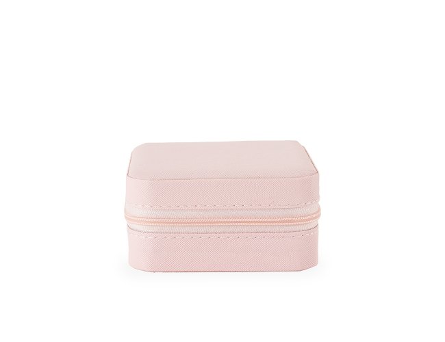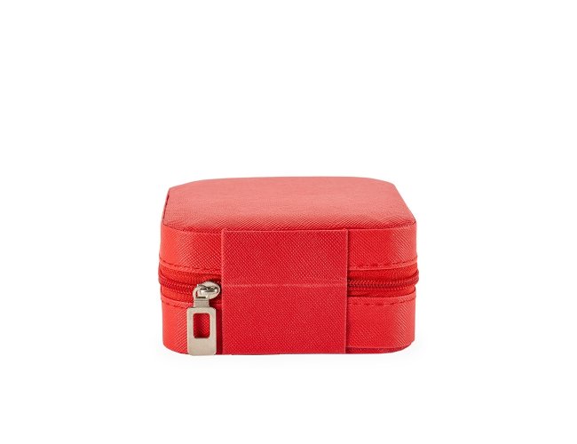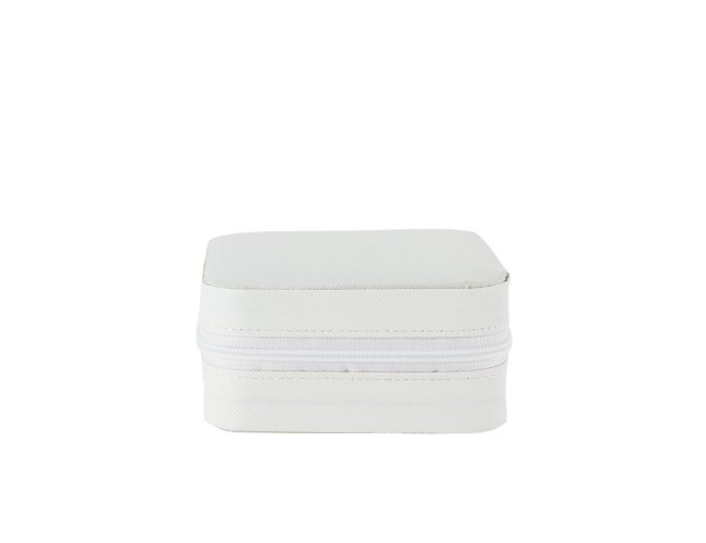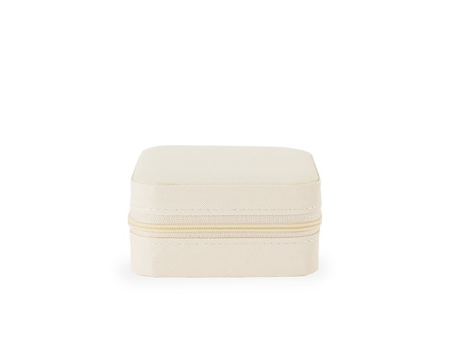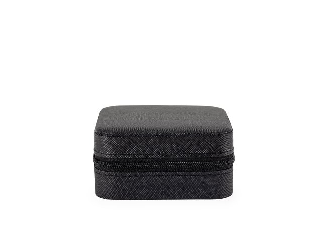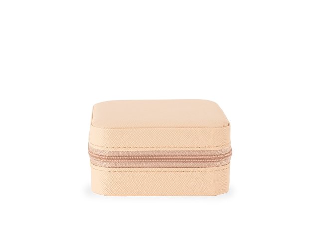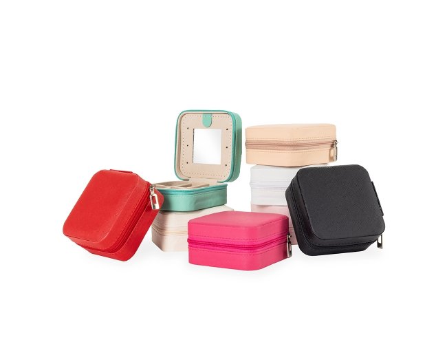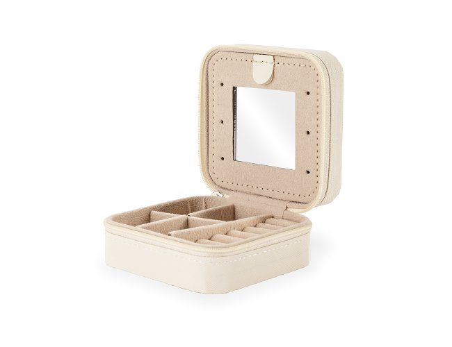 Porta-joias em couro sintético com fechamento em zíper. Possui revestimento interno em veludo, além de três ganchos pequenos, um bolso interno e uma divisória com espelho no interior da tampa. Conta ainda com compartimento removível com quatro divisórias e almofadas fixas para anéis. Apresenta marcas visíveis de cola no revestimento interno.