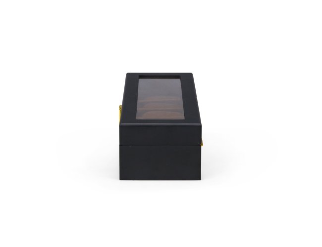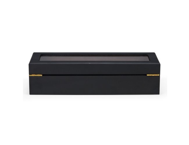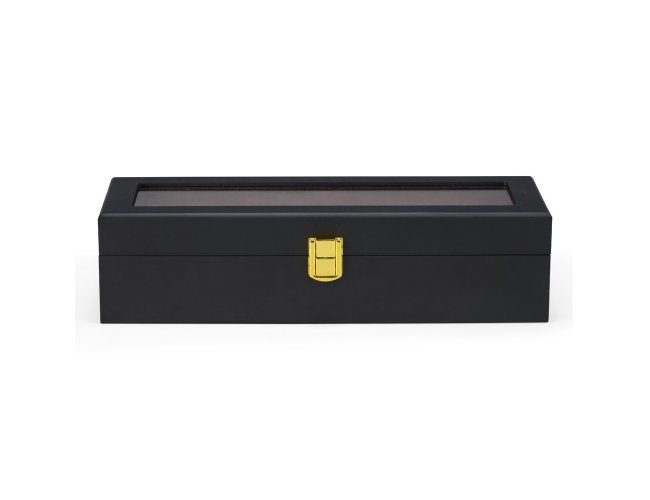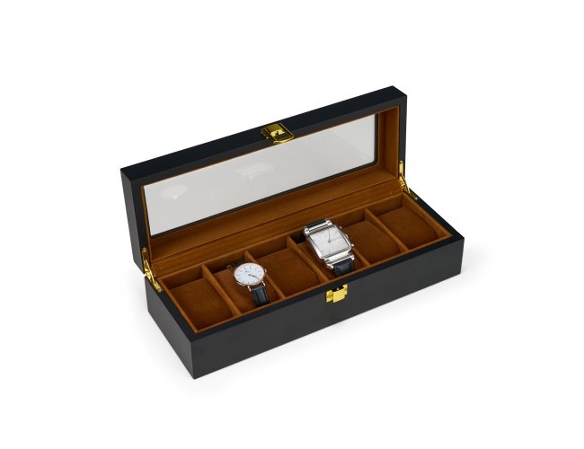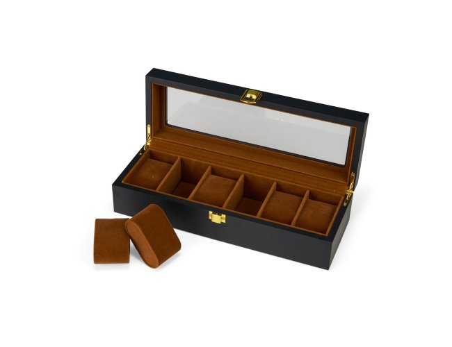 Porta-relógios feito em MDF de acabamento laqueado e revestimento interno em tecido peluciado. Possui seis divisórias com almofadas removíveis, visor em vidro e trava de segurança para fechamento da tampa.