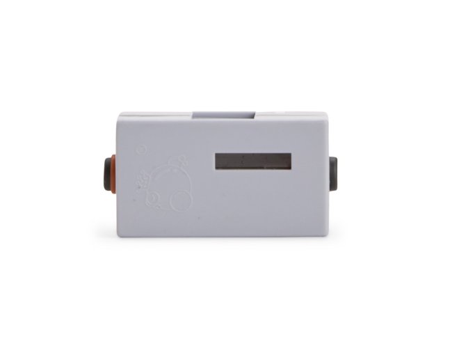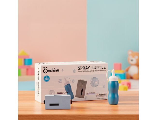 Refil para bolhas de sabão com efeito de fumaça. O conjunto é formado por um frasco de líquido para bolhas de sabão e um atomizador responsável pela geração da fumaça.