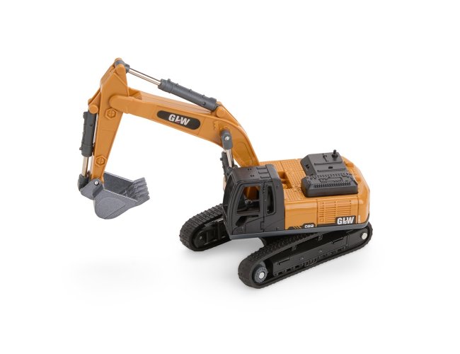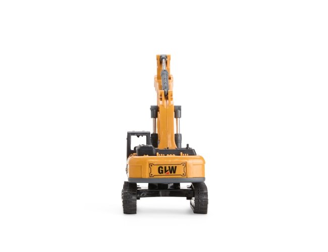 Escavadeira em miniatura com estrutura em plástico e metal, além de esteira emborrachada. Possui lança com articulação manual e cabine giratória em 360 graus.