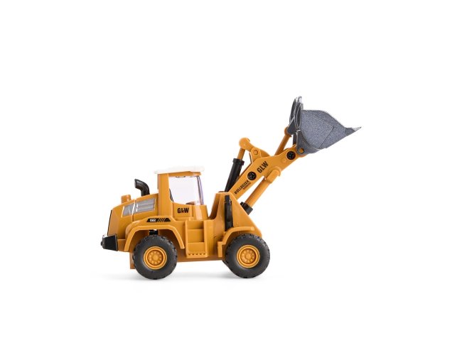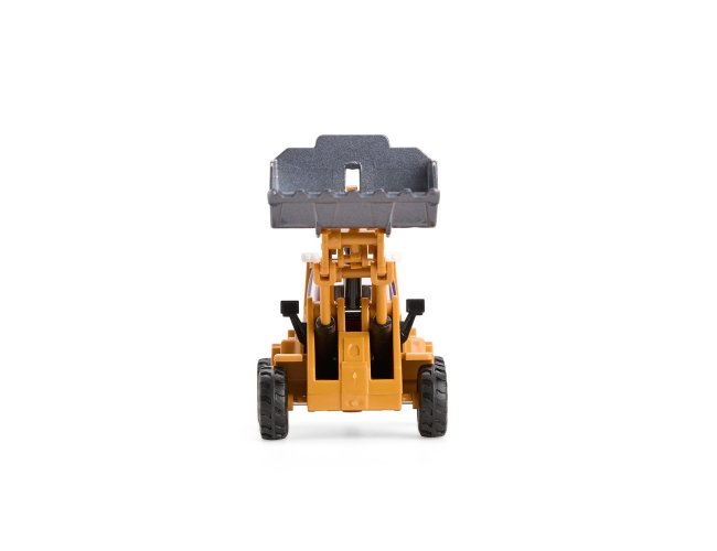 Trator pá-carregadeira em miniatura com estrutura em plástico e metal, além de pneus emborrachados. Possui lança e pá com articulação manual e mecanismo de fricção nas rodas traseiras.